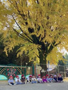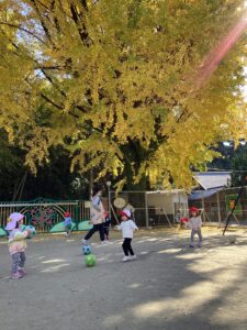 段々と寒くなり、イチョウの葉っぱも一層黄色く染まってきました。木の下には落ち葉が沢山落ちて、黄色い絨毯のようで子ども達も大喜びです。葉っぱを集めて束ねて花束のようにしたり、バケツに集めて喜んでいました。