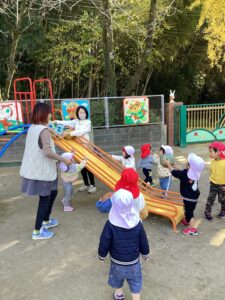 その後は園庭で好きな場所で遊びます。今日はボールを滑り台から転がす遊びをしていました。