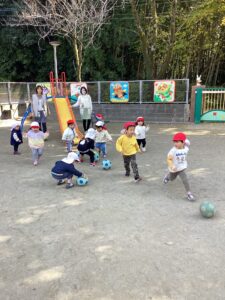 その後も先生と一緒にボール投げをしたり、蹴って遊んだりと、楽しそうなちゅうりっぷ組さんでした♪