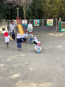 その後も先生と一緒にボール投げをしたり、蹴って遊んだりと、楽しそうなちゅうりっぷ組さんでした♪